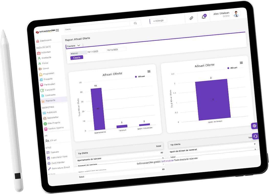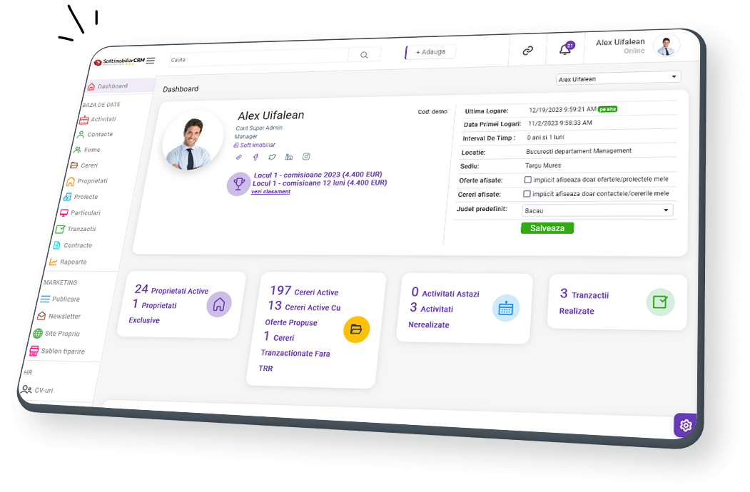 Discover the most modern websites for real estate agencies, along with the most powerful CRM in Romania. Softimobiliar CRM provides comprehensive management of your agency's operations, from handling listings and clients to generating detailed reports, offering complete control over the activities within the real estate agency you manage.